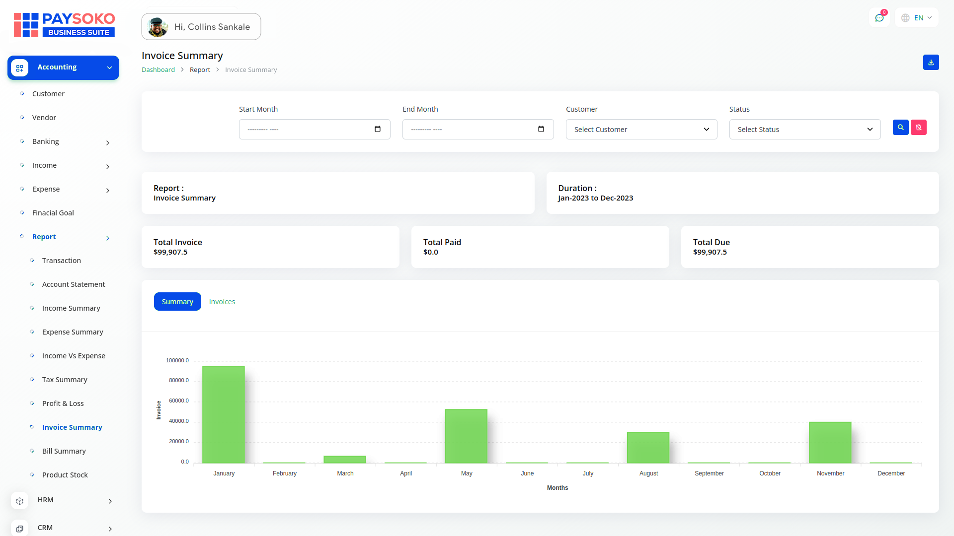 Account is an advanced account management software designed to simplify revenue calculation and handle all your business accounting needs. Powered by PaySoko Business Suite, this software streamlines your operations, making them smooth and efficient. With graphical and tabular representations of key financial elements, you'll be equipped to make informed decisions for your firm.